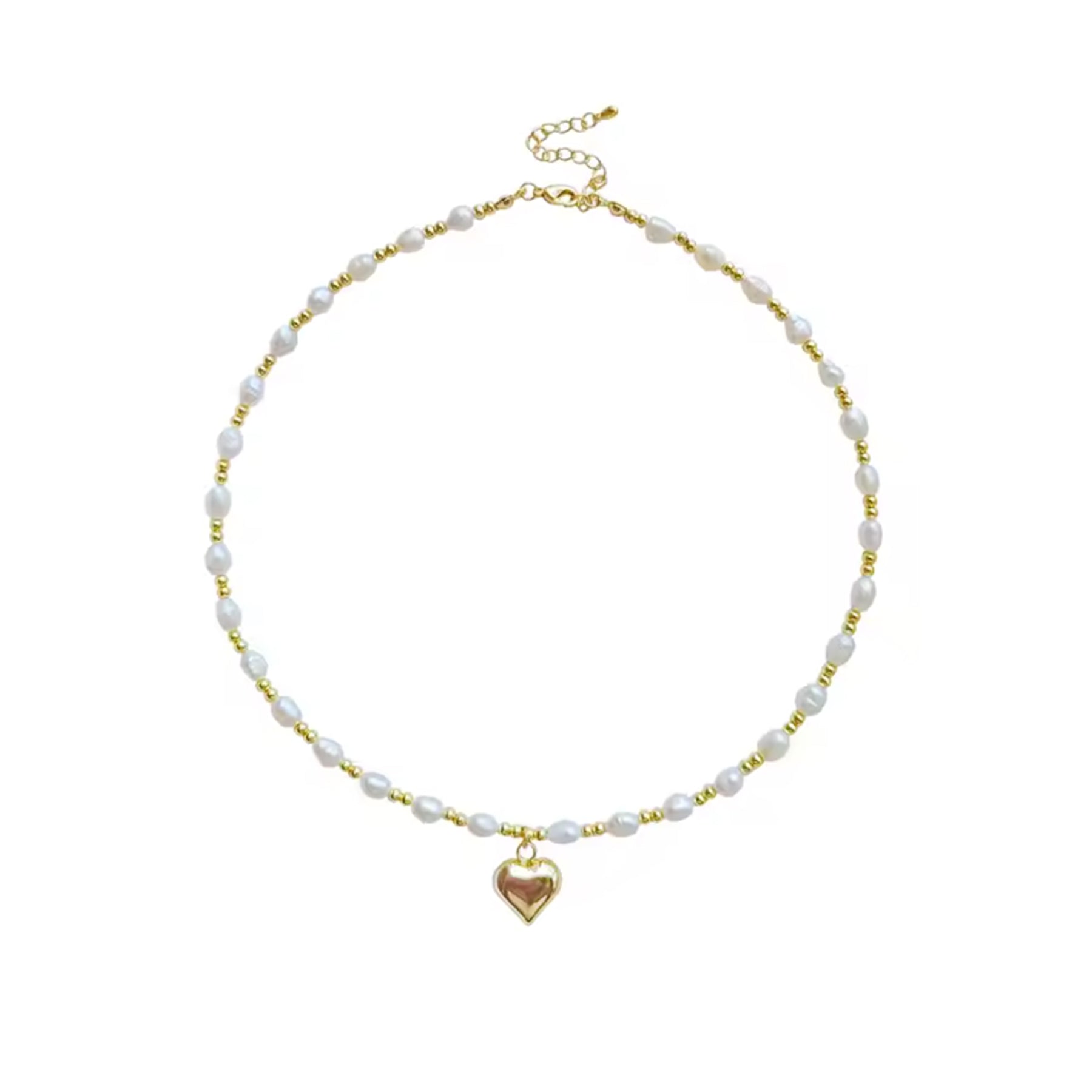 Our Pearl & Gold Chain w/ Puffed Heart Necklace is a beautiful piece from Daily Candy by Malibu Sugar. It features white faux pearls strung on a gold chain, with a gold heart