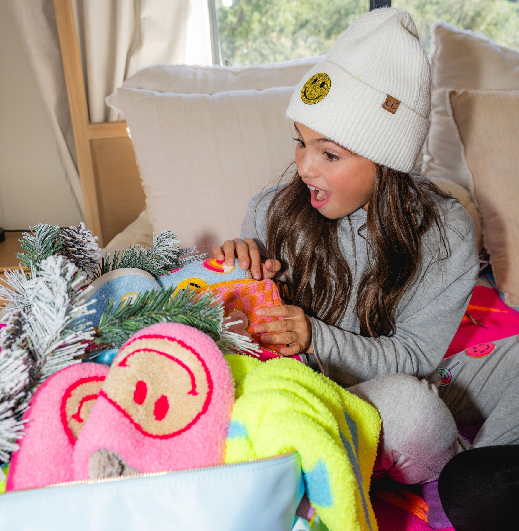 These Hot Pink Plush Slippers with a Beige Happy Face!